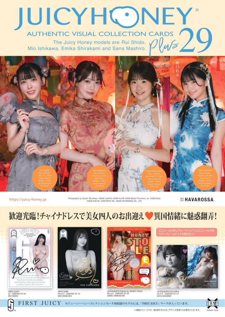 Collectible cards dari Juicy Honey PLUS kali ini gak cuma menampilkan pose-pose cantik nan seduktif dari artis JAV. Kali ini, Rui Shido, Mio Ishikawa, Emika Shirakami, dan Sana Mashiro bakal juga tampil dalam balutan pakaian dalam dan cheongsam yang berbeda. Tapi pastinya cantik-cantik dan seksi banget!