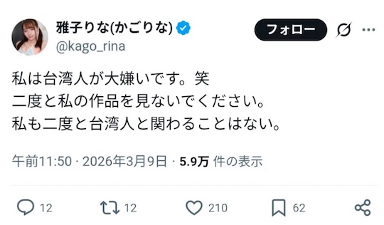 Gak cuma satu cuitan, Rina Kago masih update twit lagi meski udah diberondong massa. “Orang Taiwan menyakiti tubuh dan pikiranku, dan mereka suka. Mereka berbohong dan mengatakan mereka tidak melakukan apa pun, dan menyebarkan rumor buruk tentangku. Mereka menggunakan bahasa yang menjijikkan dan kasar, dan makan makanan berbau kencing, jadi kurasa mereka pasti gila.”